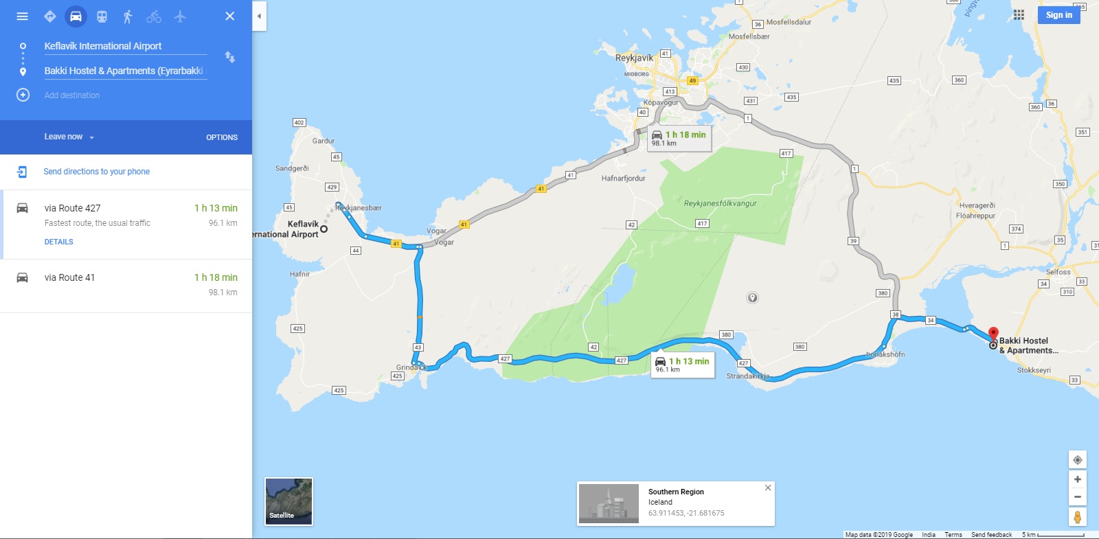 Our journey plan was to start from Keflavik Airport –> Eyrarbakki –>Reykjevik –> Skogafoss as our final point. Please see the map below: