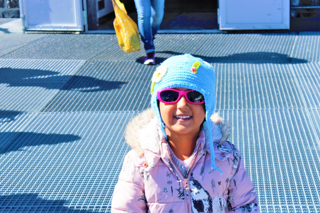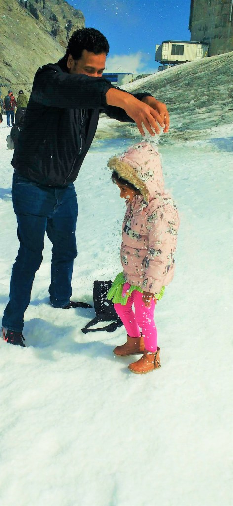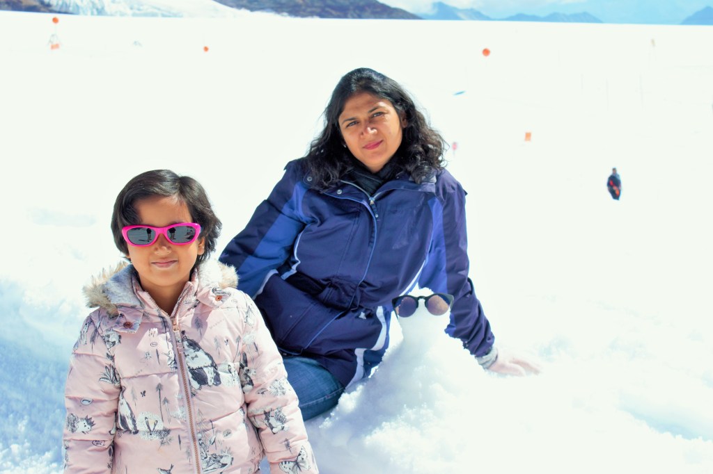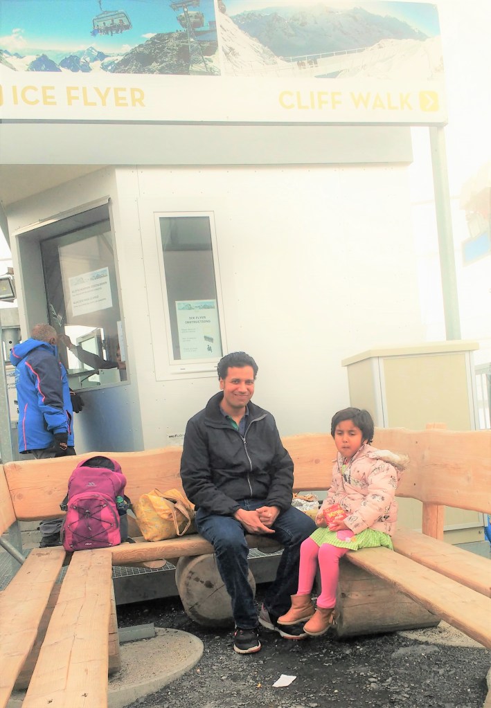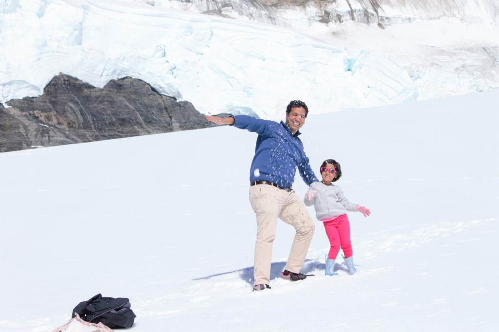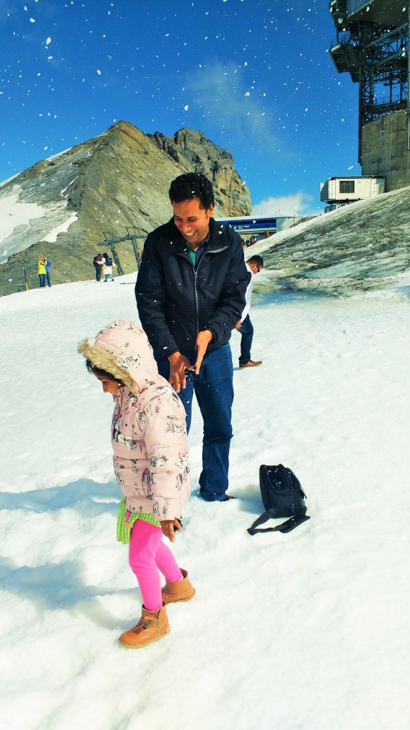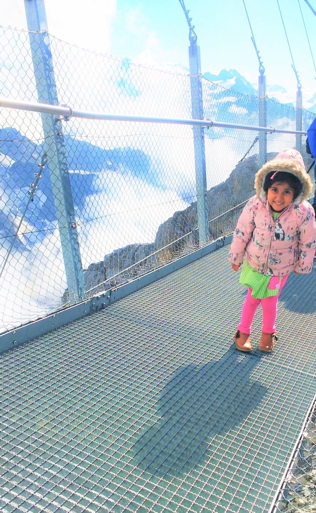 This was a very refreshing treat for all of us. The Swiss Alps is a dream destination for everyone, and we ended up playing in snow for a very long time. The views were astounding with 360* view. The place was very engaging, but of course with entrance fees for all the attractions. There was a Glacier park, Ice flyer/Glacier Grotto, Suspension bridge to check out and worth every penny. In fact,Smaira and Minal had such great time sitting on the Ice Flyer that it almost reminded me of Snowy mountain episode of Peppa Pig (just that we got to sit together unlike Daddy Pig in the episode):