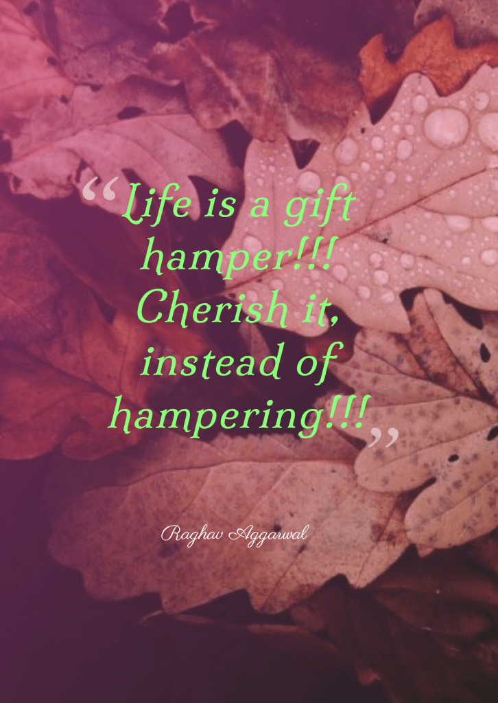 July 23, 2020 • 0 Thought for the day. Life is a gift hamper!!! Cherish it, instead of hampering!!! Share this: Click to share on X (Opens in new window) X Click to share on Facebook (Opens in new window) Facebook Like Loading... Related Categories: Random Thoughts Tagged as: gift hamper, life, quotes, thought