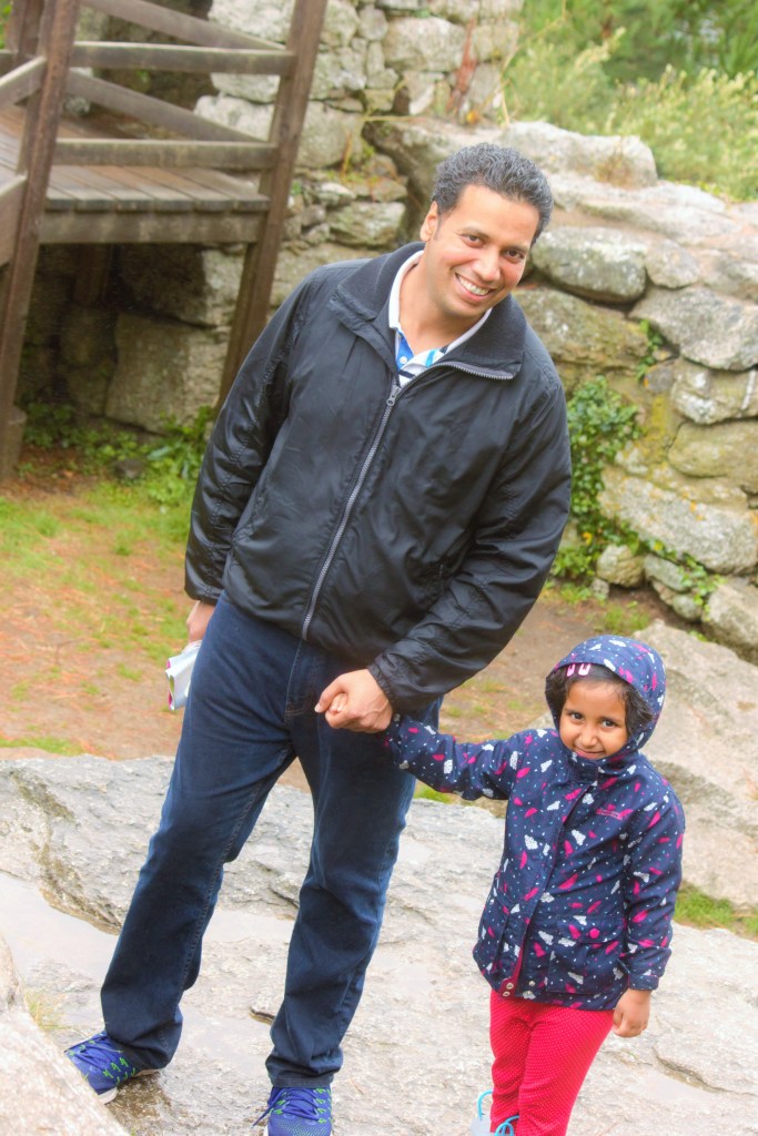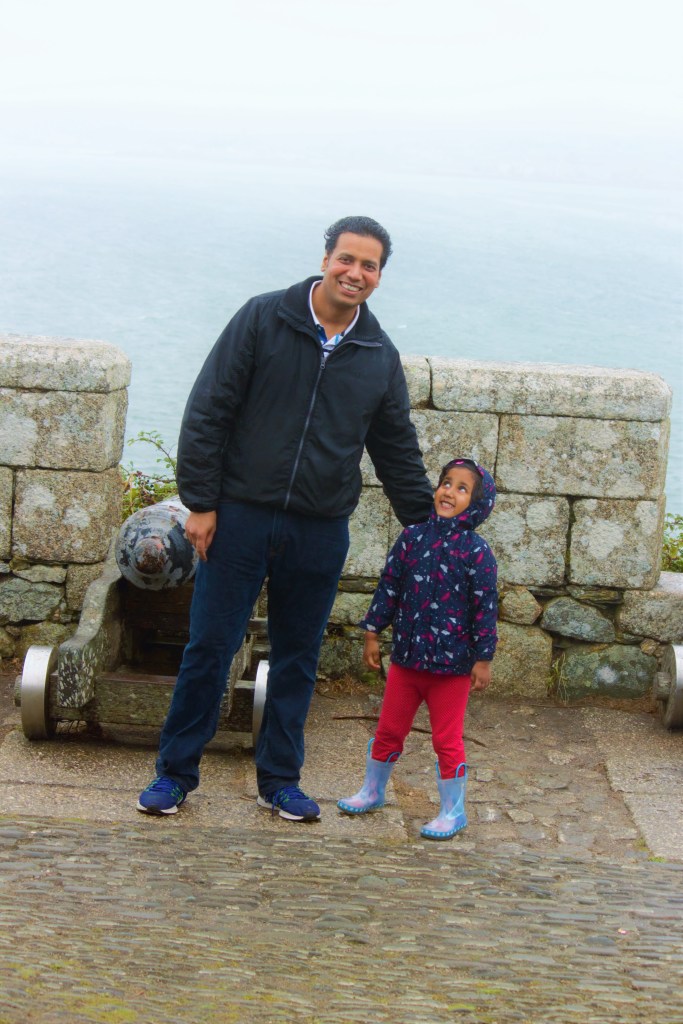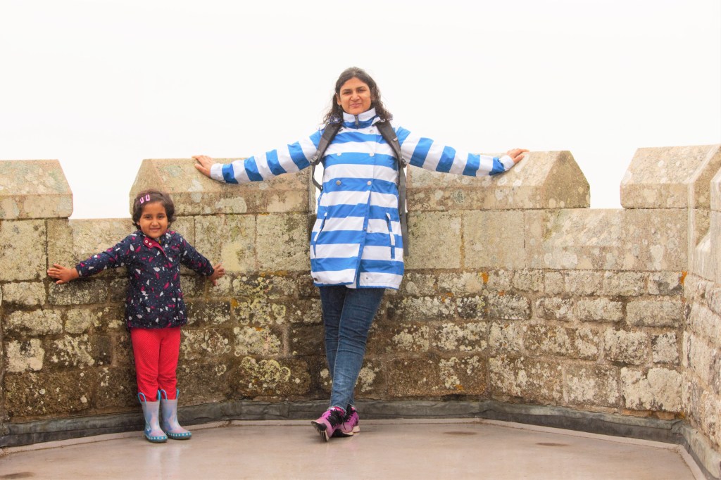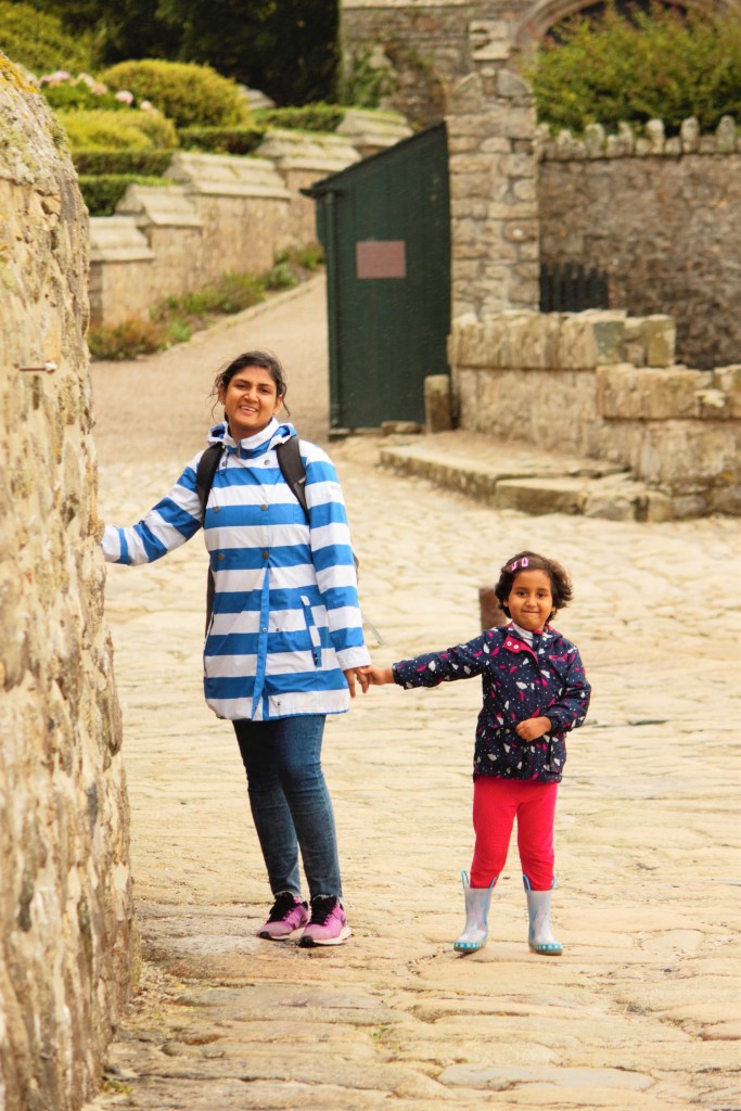 Once Smaira was up, we got ready and the first stop for the day was St. Michael Mount. It continued to drizzle and we thought we might have to skip our plan to go all the way up the mountain to see St. Michaels. St Michaels Mount is connected to mainland through a bridge from the beach. When we started walking on the bridge, the high tide was already on, but the level of water was just touching our shoes and we could walk. But soon after, when we reached midway, Smaira got real scared since the water rose up to her knees in no time. We two were also a bit scared, but we tried to tell her it’s a game and we have to take one big step at a time and we shall be on the other side very soon. We were shocked when we actually reached the other side of the bridge. I turned around to see the bridge has been closed and no more tourists are allowed. We were the last ones to board and move over. These moments and experiences really makes our trips adventurous.