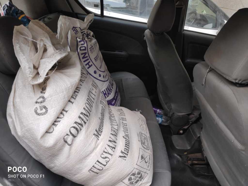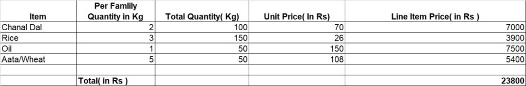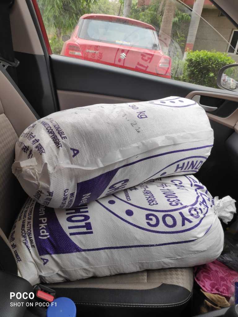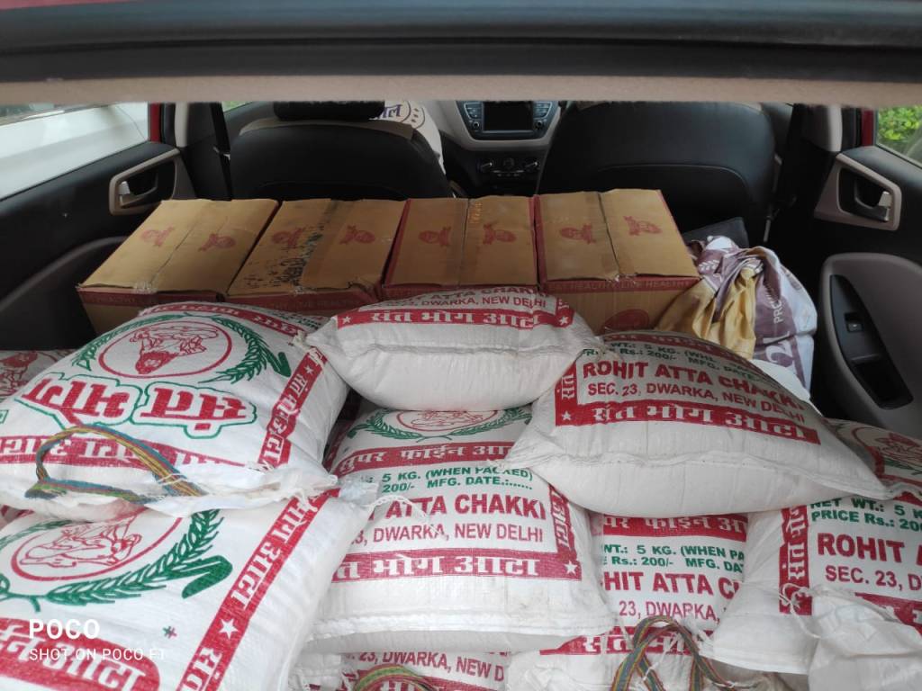 After having made a thorough assessment about the families living here, the kind of work they do, the number of members in each family, we made a list with the help of a local individual who was part of the same community. Then we both decided to act sooner than later by amassing the groceries/ration needed for this drive. We contacted many wholesalers in and around Dwarka and finally were able to procure 250kg of wheat flour (atta), 100kg of Chana dal (pulses), 150kg of rice, and 50 litres of cooking oil to be distributed amongst 50 families. Soon we realized that this would total up to 550kg approx. for which we would need to borrow another car from our dearest and very helpful cousin. A quick snapshot of amounts procured with costing in INR is as given below: