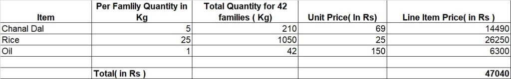 We also changed our approach this time. We decided to give at least a month’s ratio/staple requirement this time for each family so as to make it possible for them to tide over the current tsunami. Accordingly, after having gathered inputs, and with a larger set of family members/friends supporting us, we procured 25kg Rice, 5kg Chana dal, 1 liter cooking oil for every family. To give a glimpse, here’s the snapshot summary: