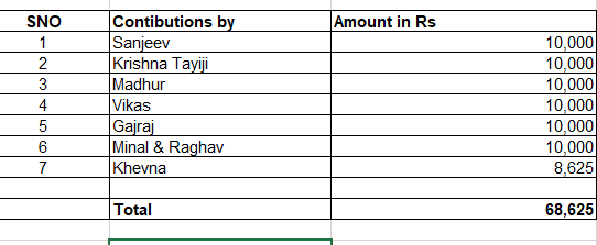 And last but not the least, the entire drive had a cost of Rs. 68625 which was funded by Sanjeev, Krishna Tayiji, Madhur, Vikas, Gajraj, us, and Khevna.