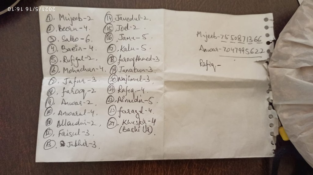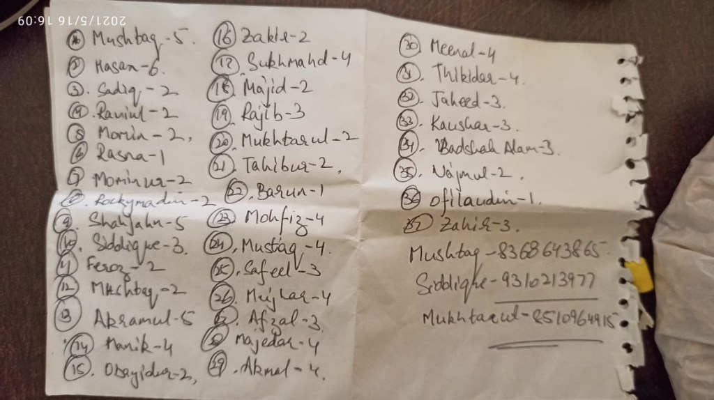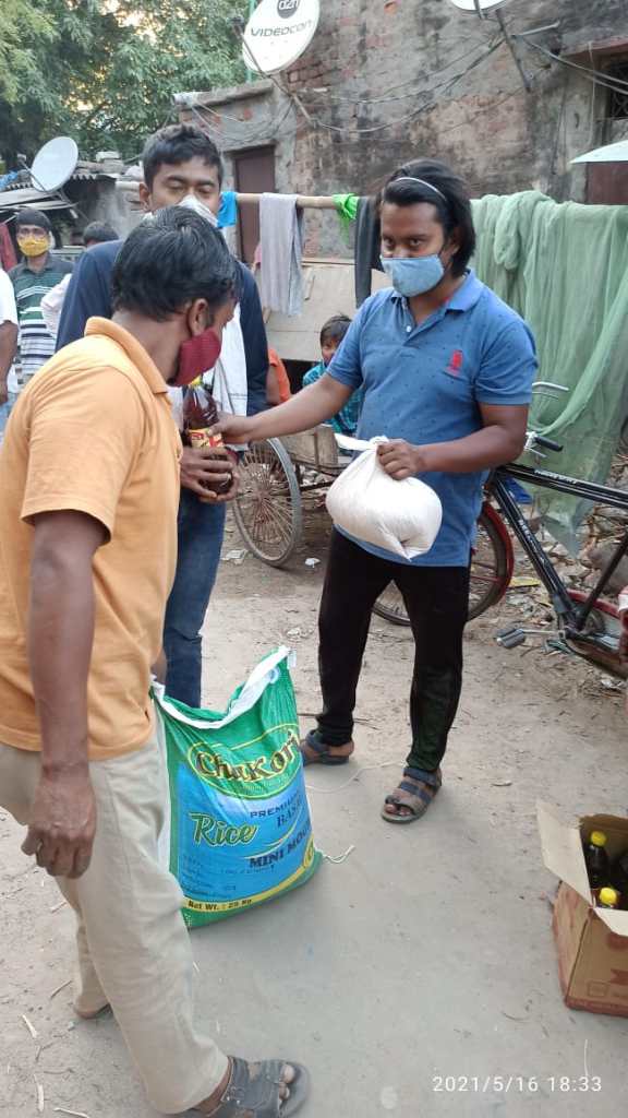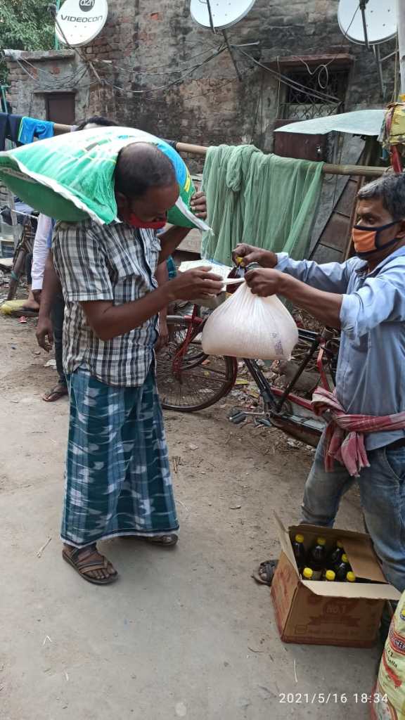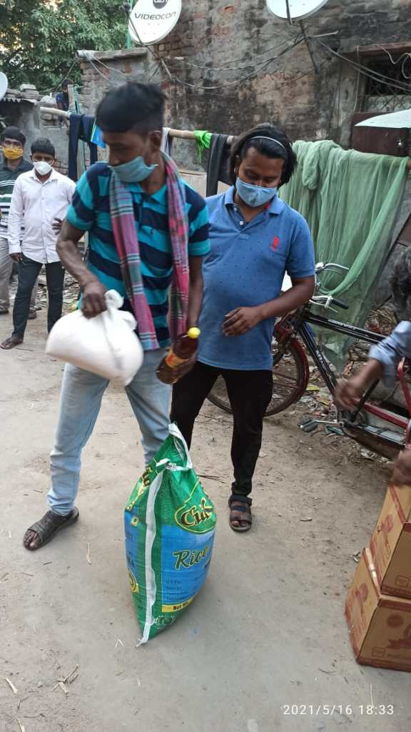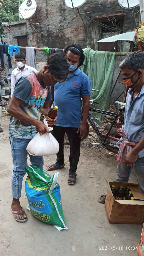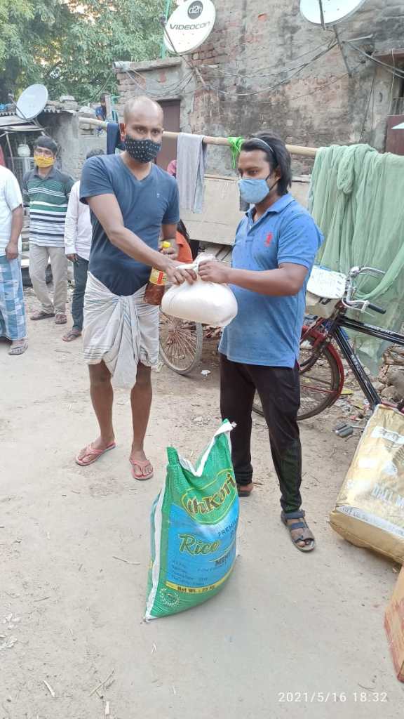One day prior, I visited this place in the evening to look out for daily wage workers, constriction workers in need, the maids who have been out of job or not paid because of banned entries in societies, the car drivers/cleaners etc. After having surveyed the area and talked to few rickshaw pullers and other local people, I was informed there is a community of Bengali workers living in shanties/slum in Pochunpur. I went to this place and talked to the people here. There were few individuals like Mujeeb, Mushtaq, Siddique, Anwar who came forward to talk to me. They told me that most of them are daily wagers and living with mere/suppressed earnings or no earnings at all after the advent of Covid. There were two rows of shanties here which comprised of 37 families in one and 24 in another. I did not get the courage to look at the area by going in too far once entered through the gate.