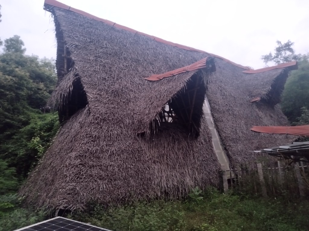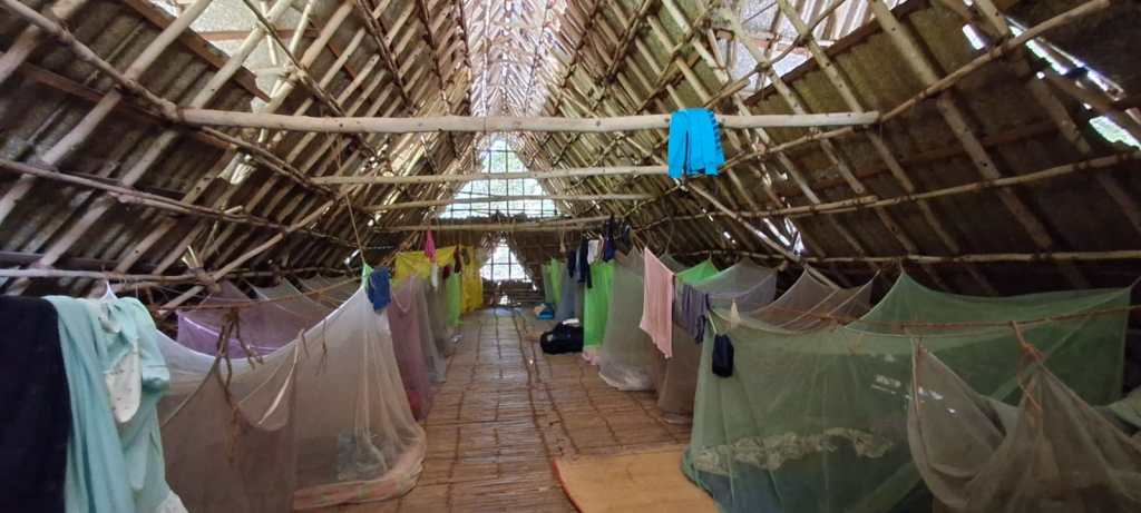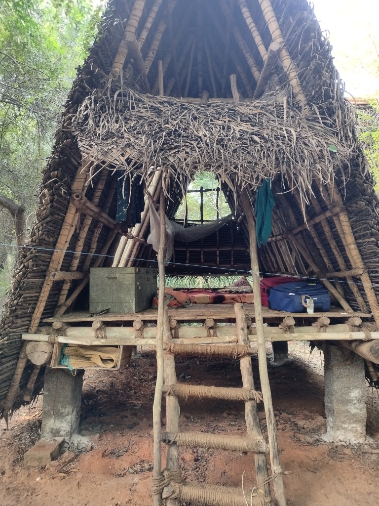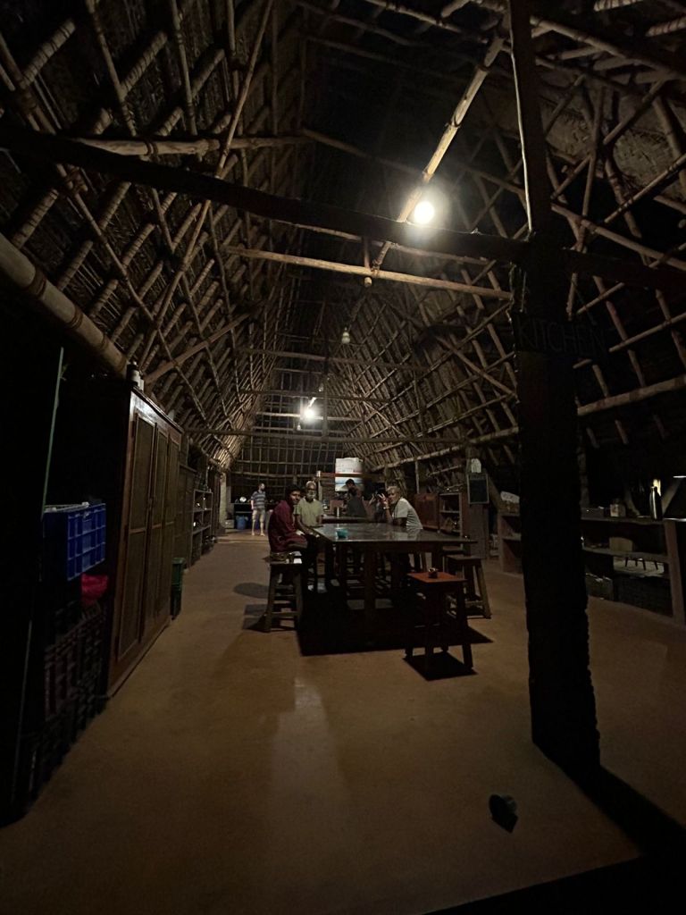 Initially, due to the unavailability of private huts, we stayed in a 22-bed dormitory, a structure crafted from bamboo with a tin-sheet roof made from recycled tetra packs. Now, being a Punjabi, coming from Delhi it felt a bit odd to be staying in a common dorm (for men and women). The absence of doors and the trampoline at the back for changing clothes felt unusual at first. One must knock at the trampoline to check if anyone is inside, before barging in. It all felt a bit too odd. Yet in few days, the communal lifestyle quickly normalized these unique features, reflecting the community ethos of Sadhana Forest.