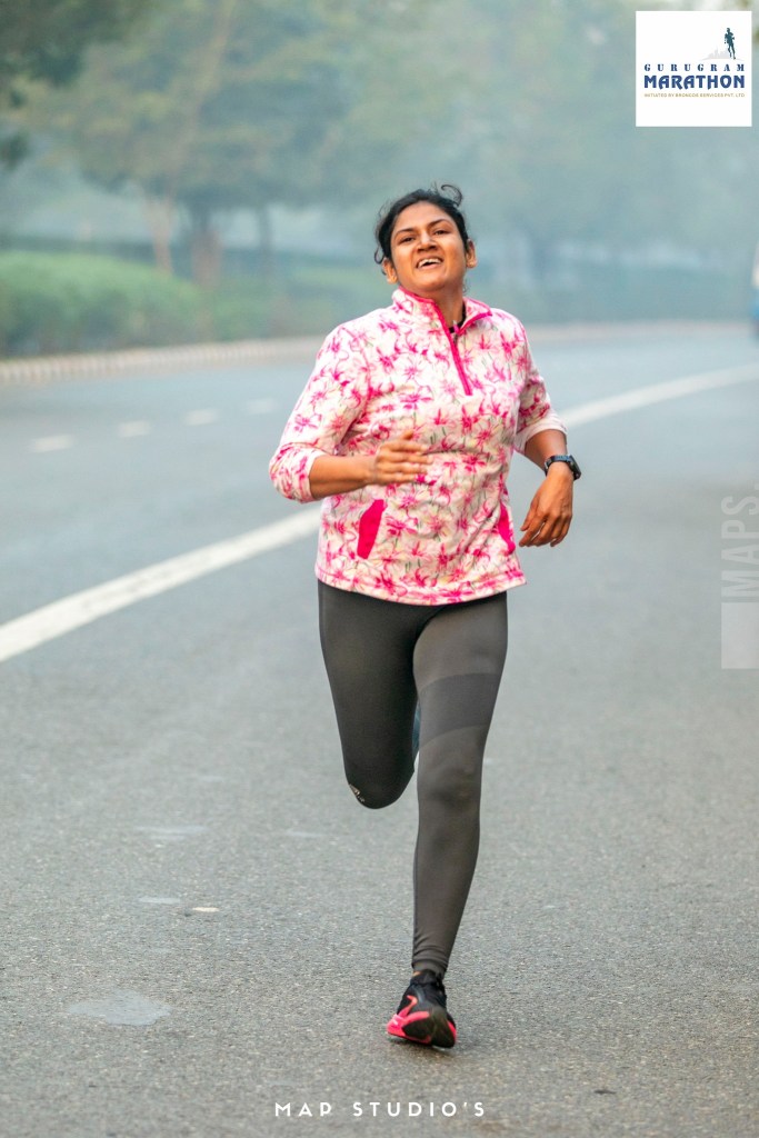 As we were nearing the finish line, which was about 100 meters away, Akshay suggested, “Minal ji, let’s sprint to the DXR point.” I agreed and ran as fast as I could. Surprisingly, there was a photographer there. I anticipated Akshay to run past me, but he didn’t. I was a bit surprised and glanced back slightly to see why he hadn’t surged ahead. But I continued sprinting, and we finished together.