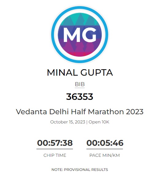 Now this was the run, I was truly waiting for as I have been following this run from last one decade, but never thought of participating in it owing to the huge crowds it attracts. But now that I had registered, I was looking forward to running on the beautiful streets of central Delhi. I started off well, with the first 1 km in 5:19 mins and that set the tone of the 9 kms. I ran it comfortably and felt so strong that I literally sprinted in the last 100 mts. I finished in 57:39 mins. Goal achieved! I was happy and content and thought the Vedanta run would be my last 10 kms official run as my goals were achieved. Read ahead to know why I still tried to improve my timing.