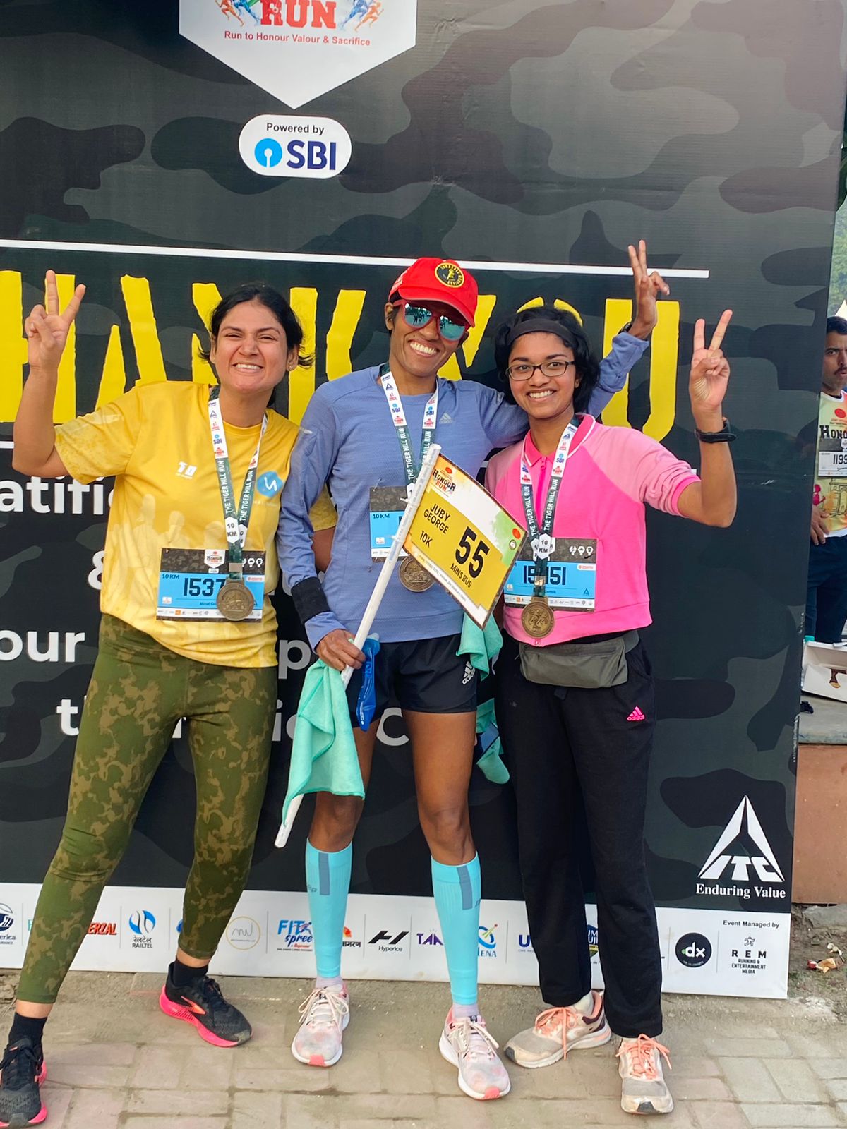 As I went on the race day, me and Akshay did a proper warm-up pre-run (he is just a good buddy and the best person to guide through a warmup routine). As I navigated through the crowd, I finally saw Juby there holding the pacer flag. I introduced myself and sought her support. She was so brilliant. She told us the first km will be done in 5:35 mins and progressively, we shall try to keep every km under 5:25 mins to keep a buffer. Throughout the whole run, she kept encouraging me. Also, with a long experience under her belt, she kept the pace uniform throughout which even helped the breathing as well. I felt so happy and content running with her that around 8 kms, I started talking to her; only to realize in the next few mins “I should keep my mouth shut and save my energy to speed up in the end”. With around 200 mts to finish line, she told me to sprint ahead and so I did finish in just under 55 mins. It didn’t feel tough, it felt so natural and felt so good.